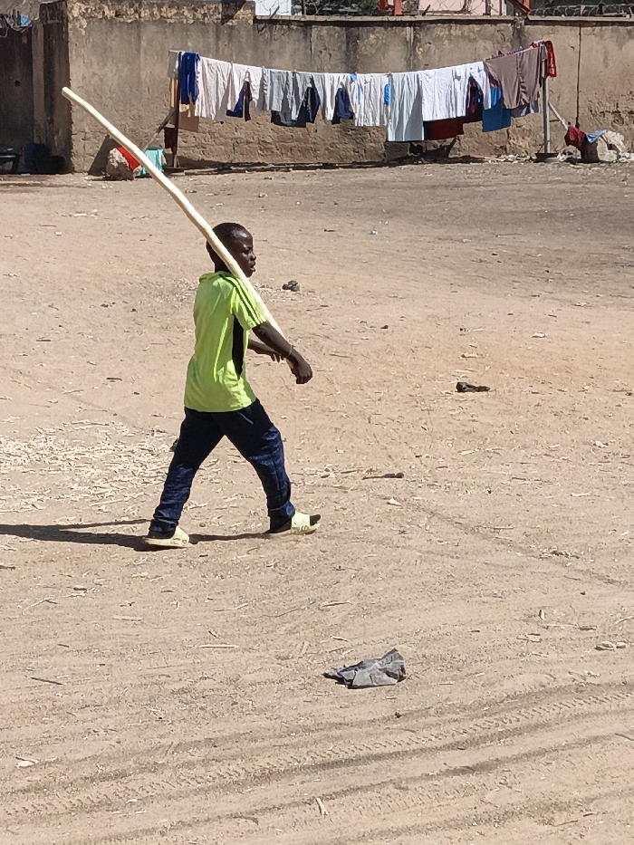 - "A young male, possibly a child or adolescent, with dark skin and short dark hair, is depicted walking from left to right across a sunlit, dusty, and sandy outdoor area in Zango, Nigeria" by FM-Bh3W72, licensed under CC BY 4.0