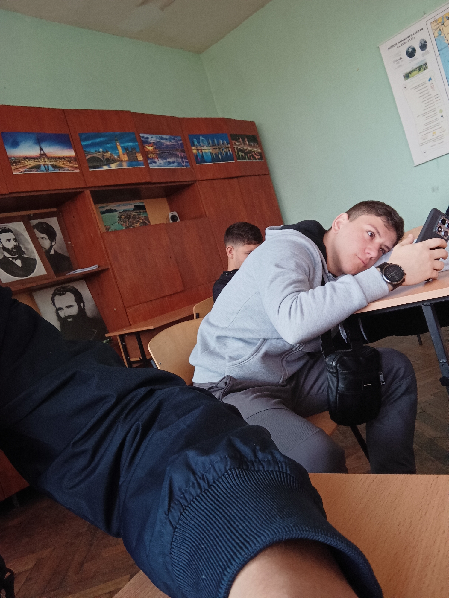 The image depicts an indoor scene, likely a classroom, with a person in the foreground wearing a dark blue jacket with a ribbed cuff. The jacket extends towards the bottom left corner of the image, partially obscuring the view. In the middle ground, a young man is seated at a desk. He is wearing a light gray hoodie, dark gray pants, and a watch on his left wrist. He is leaning on the desk, holding a smartphone in his right hand. A black bag is slung over his body. Another person is partially visible behind him. The background includes wooden shelves with various pictures, portraits, and other items. The walls are painted a light green color. A poster with text and graphics is visible on the wall to the right. The presence of desks and other school-related items indicates that the location is a classroom, but the specific city is not identifiable from the image.