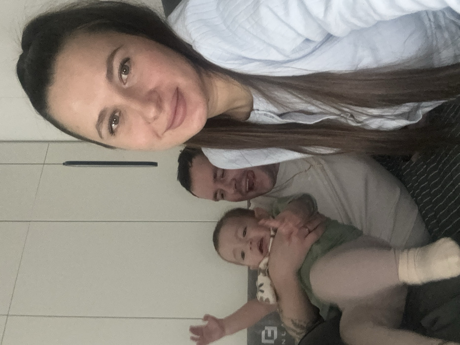 A woman with long brown hair smiles in the foreground. Behind her, a man grins while holding a baby with light skin, wearing a green shirt and white socks. The baby also appears to be smiling. The background includes a white tiled wall with a black handle and a striped surface. The image seems to be taken at an angle, tilted to the side.