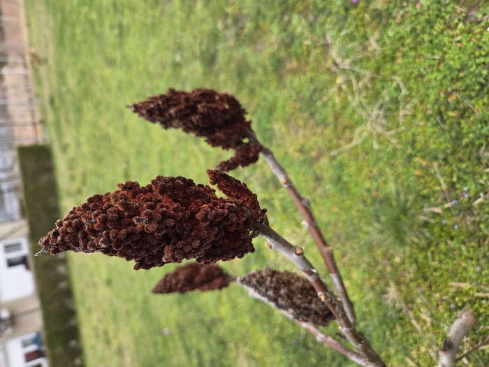 - "The image displays a close-up, ground-level view of a plant with multiple clusters of dried, reddish-brown seed heads on bare, light brown branches" by FM-kxY1D3, licensed under CC BY 4.0