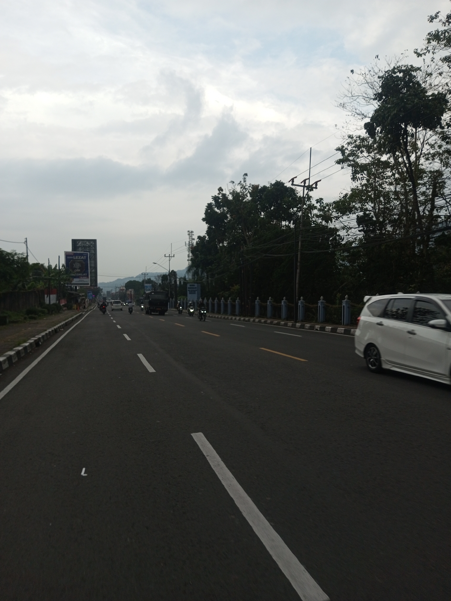 The image depicts a road in Ciherang, Indonesia. The road has two lanes with white lane markings. A yellow line separates the lanes in one direction. On the left, there is a sidewalk with a black and white curb. A billboard is visible in the background. A row of trees lines the right side of the road, bordered by a low blue and white fence. Various vehicles are on the road, including a truck, motorcycles, and a white car in motion. The sky is overcast with gray clouds.