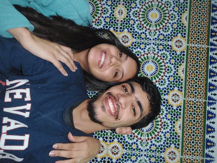 A young couple smiles while lying on a vibrant, patterned surface. The woman has long, dark hair and wears a light blue top. She rests her head on the man's shoulder. The man has dark hair and a beard, wearing a navy blue sweater with "NEVADA" printed on it. The background features colorful geometric tile patterns with stars and floral motifs. A decorative border is also visible along the right edge.
