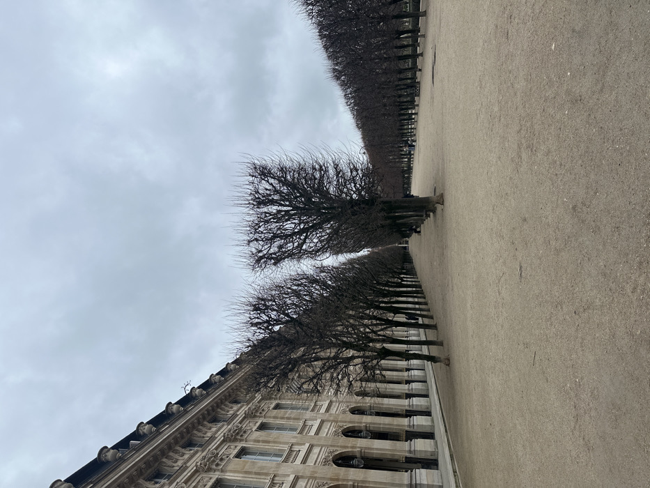 The image displays a long, wide perspective of the Palais Royal Garden (Jardin du Palais Royal) in Paris, France, under an overcast sky. A broad, flat sandy gravel path extends from the foreground into the distance, occupying the central and right portions of the frame. To the left, a classical stone building, part of the Palais Royal complex, runs parallel to the path. This structure features multiple stories with arched ground-floor openings, rectangular windows on upper floors, ornate architectural details including pilasters, cornices, and decorative urns lining its rooftop. Hanging light fixtures are visible within the ground-floor arches. A paved walkway borders the building at ground level. The main path is flanked by rows of uniformly pollarded deciduous trees with bare branches, indicative of a cold season. Additional rows of similar trees are visible further to the right, beyond a parallel, less prominent path. Several individuals are sparsely distributed in the mid-ground and background, appearing to walk along the paths or sit on benches. The sky is a uniform, light gray.