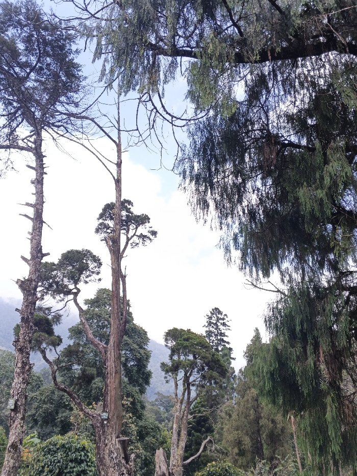 This image depicts a dense forest scene in La Castellana, Philippines, viewed from a low angle looking upwards towards the sky. The foreground and midground are dominated by several tall trees with varying bark textures and foliage. On the left, a tall tree with dark, rough bark features two light-colored, rectangular wooden objects, possibly birdhouses or informational markers, affixed to its trunk. Another prominent tall tree in the center has a slender, lighter-colored trunk and a dense green canopy at its top. To the far right, a tree with long, pendulous, dark green foliage hangs down, partially obscuring the view. The background consists of a layered canopy of diverse green trees, suggesting a hilly or mountainous terrain, with the distant peaks appearing hazy under a light blue sky with scattered white clouds. No people are visible.