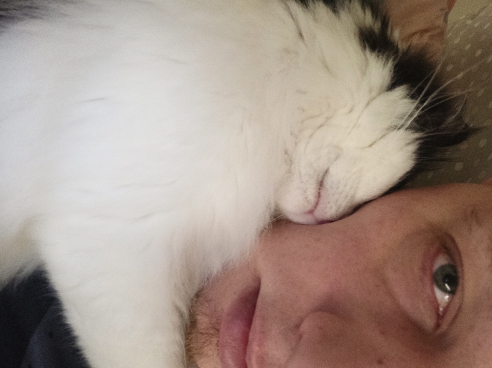 A close-up image depicts a male individual and a domestic cat in an indoor setting within the city of Кондратово, Russia. The cat, identifiable by its white and black fur and closed eyes, is positioned with its head resting against the right side of the human's face. The human's right eye, which is green, is partially visible and directed towards the camera. The human also exhibits light facial stubble on the chin and jawline. A portion of the human's mouth is visible. The cat's white fur dominates the lower and left sections of the frame, suggesting a long-haired breed. In the upper left background, a light-colored, subtly patterned fabric is present. The human appears to be wearing dark clothing, visible at the bottom edge.