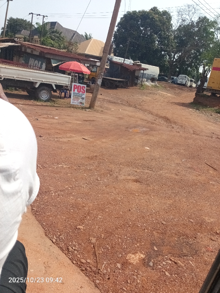 This image captures an outdoor street scene within Enugu, Nigeria, under daylight conditions with a bright, hazy sky. The primary visual element is a wide, unpaved, reddish-brown dirt road, rough in texture with scattered small stones and minor ruts, occupying the central and right portions of the frame. In the immediate foreground, at the bottom left, the left shoulder and upper arm of a person wearing a white shirt are partially visible, with a dark garment, possibly trousers, at the bottom edge. A concrete curb runs along the lower left corner. An overlaid timestamp reads "2025/10/23 09:42". To the left of the dirt road, in the midground, a white light-duty pickup truck with an open flatbed is parked, facing left. Behind the truck and extending to the right are several rudimentary commercial structures, characterized by corrugated iron roofs and makeshift walls. One visible structure bears the painted word "WOLF". In front of these structures, a red open umbrella stands, shading a small setup. Directly beneath the umbrella, a white rectangular sign prominently displays "POS" (Point of Sale), indicating a mobile money or banking service. A small blue plastic stool is positioned near the POS sign. A wooden utility pole stands upright to the right of the POS sign. The dirt road slopes gently uphill and curves slightly to the right into the background. Distant vehicles are visible on the road, including a white passenger van and what appears to be part of a yellow truck. Large, dense green trees dominate the upper right background. On the distant left, above the makeshift shops, residential buildings with varying rooflines are discernible.