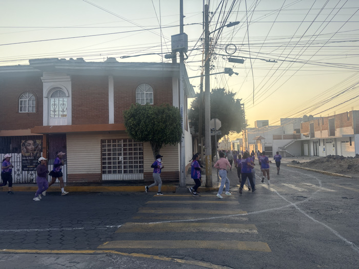 The image presents a street scene in San Andrés Cholula, Mexico, captured during what appears to be early morning, characterized by a soft, warm light across the horizon. Approximately 20 to 30 individuals are observed on and around a paved street. The majority are women, many wearing purple shirts, engaged in running, jogging, or walking across a yellow-striped pedestrian crosswalk and along the street. On the left side of the street, a two-story building constructed of red brick with an orange ground-floor facade features an arched main entrance with decorative ironwork and multiple arched windows. A commercial advertisement, possibly for a beauty service, is displayed on its lower level. A small, leafy tree stands in front of this building. Numerous tangled overhead utility lines are prominently visible, extending from multiple utility poles along the left street edge. The asphalt street in the foreground exhibits some surface cracks, with white lines also painted on the pavement. On the right side of the street, a large mound of dark soil or construction debris is present. Beyond this, a series of buildings, some appearing residential and others in various stages of construction with exposed brickwork, line the street into the distance. The sky is clear, transitioning from a light yellow hue at the horizon to a pale blue above.