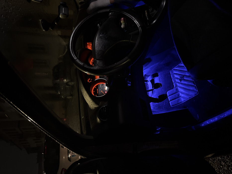Inside a car at night, the dashboard glows red, illuminating the speedometer. A steering wheel with a decorated cover dominates the frame. The footwell is lit with a vibrant blue light, revealing the pedals and textured floor. The image is dark, with details emerging from the contrasted light sources.