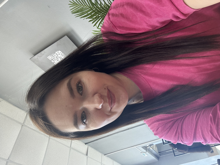 A female subject, appearing to be in her 20s or 30s, is positioned centrally in a well-lit indoor setting, looking directly at the camera with a faint smile. She has long, straight dark brown hair, light-colored eyes, and is wearing a plain, bright pink long-sleeved crew-neck shirt. Small hoop earrings are visible in both ears. The background indicates a commercial or office environment. To the upper left, a white drop ceiling with rectangular tiles and a grid system is visible, adjacent to a light grey wall. A dark door frame and a white sign bearing blue Cyrillic text, partially legible as "ВЫХОД" (Exit), are present on the far left. To the upper right, a darker grey wall displays a square, dark-colored panel featuring a prominent white QR code. An artificial green plant with palm-like fronds is situated in the lower right background. This scene is located within an indoor commercial or office establishment in the city of Chaikovsky, Russia.