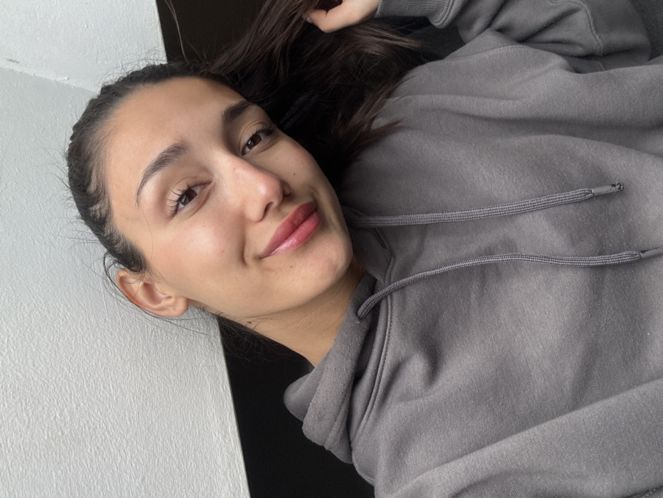 The image depicts a close-up, slightly tilted portrait of a single female individual, estimated to be a young adult, with fair to medium skin tone. She has dark hair, partially pulled back but with some strands loose, dark eyes, and pronounced eyebrows. Her lips are glossy with a pinkish tint, and she exhibits a subtle smile, looking directly at the camera. She is wearing a charcoal-grey hooded sweatshirt (hoodie) with visible drawstring cords, the fabric of which shows some pilling. Her right hand is visible on the right side of the frame, appearing to gently touch or hold her hair. The background consists of a textured, light grey or off-white wall on the upper left, transitioning to a darker, indistinct area behind her head and left shoulder. The specific location within the city of Kraljevo, Serbia, cannot be determined from the visual information provided in the image.