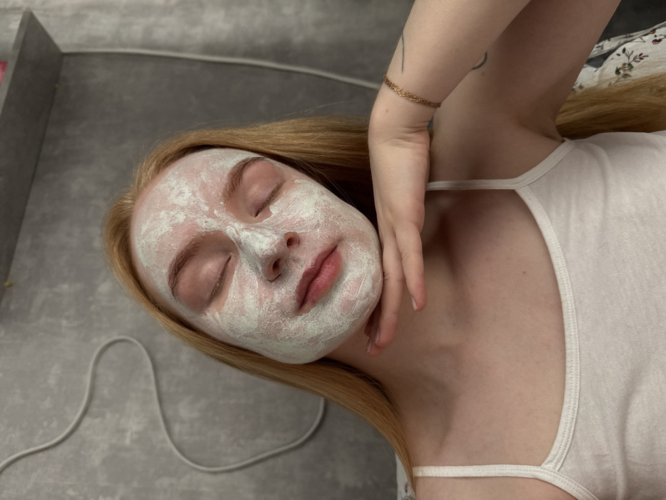 A young female subject with long, reddish-blonde hair is depicted in a close-up, facing forward with her eyes closed. Her entire face is covered with a light green facial mask, excluding her eyelids and lips. She is wearing a white spaghetti-strap tank top. Her right hand is positioned under her chin, with fingers extended. A golden-colored braided bracelet is present on her left wrist, and a faint dark mark is visible on her upper left arm. The background consists of a textured grey wall. A white electrical cable is affixed to the upper left wall in a distinct wavy pattern. On the upper right, a grey shelf holds a pink rectangular item and a small yellow item. The scene is set within a residential interior in Chaikovsky, Russia; the precise address or specific area of the city is not discernible from the visual evidence.