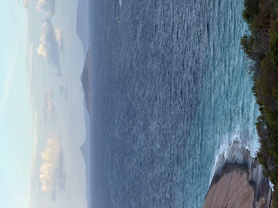 This image depicts a coastal landscape in the city of West Beach, Australia. The foreground features dense, low-lying green and brown coastal vegetation on the lower right, and a large, smooth, light brown and grey granite rock outcrop on the lower left, sloping towards the water. Turquoise ocean water with breaking white foam meets the rock and extends horizontally. The water transitions to a darker blue in the midground, with visible wave texture. A small, dark-colored boat with a white wake is observed traveling from right to left in the mid-right portion of the ocean. In the background, several islands and distant landmasses rise from the dark blue water, appearing as dark brown/green and blue-grey silhouettes against the horizon. The sky is a pale blue with scattered white cumulus clouds. No individuals are visible in the scene.
