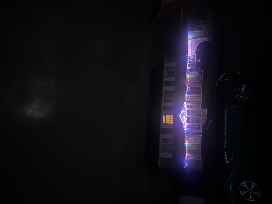 A dark, nighttime scene depicts a multi-story building adorned with colorful lights. One window emits a warm, yellow glow. To the right, a vehicle is partially visible. The left side of the image is dominated by a dark sky with a faint, obscured moon visible through the clouds. The photograph has been rotated 90 degrees clockwise.