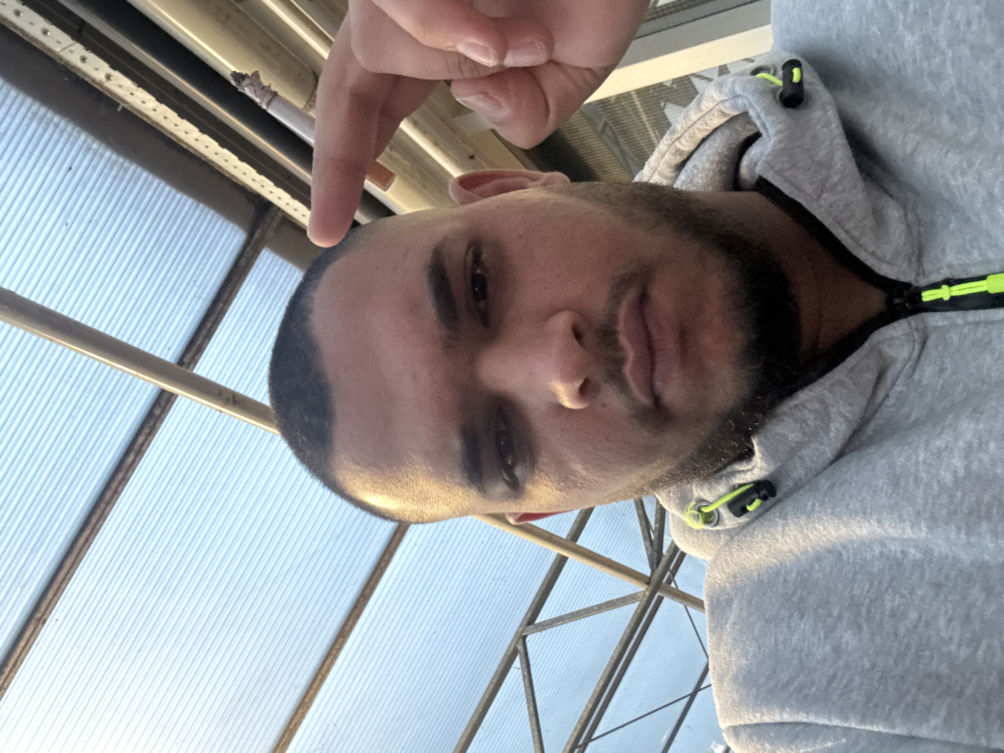 A close-up image depicts an adult male with short dark hair and a beard, looking directly at the camera. He wears a grey hooded sweatshirt featuring black and neon yellow zipper and drawstring accents. His right hand is raised to the upper right side of his head, holding a lit cigarette with a visible ash tip between his index finger and thumb. The background reveals the interior of a structure with a translucent, ribbed roof and metal support beams, indicative of a greenhouse or similar industrial building. This scene is located in Delfgauw, Netherlands.