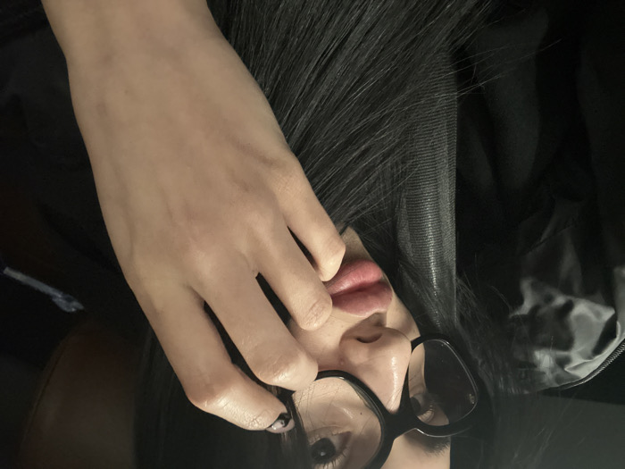 The image displays a close-up, angled view of an individual, likely female, situated within what appears to be the interior of a vehicle. The exact location within Varna, Bulgaria, cannot be determined from the visual information present in the image. The subject has long, dark, straight hair, partially obscuring the left side of the frame. They are wearing large, black-framed glasses, possibly with a cat-eye style, which reflect ambient light. Their right eye is visible through the lens, looking directly towards the viewer. The subject's lips are full and exhibit a reddish hue. The right hand is raised, with fingers lightly touching the frame of the glasses near the temple. The nails on the visible fingers are manicured, with one nail displaying a dark and light pattern. The individual is wearing a dark, possibly black, garment that appears to be a jacket or coat, visible on the left side of the image with a textured surface suggestive of fabric. The background on the right is dark and indistinct, consistent with a vehicle's interior seating or upholstery. Lighting is relatively dim, with a primary light source illuminating the front and left side of the subject's face and glasses. No other individuals or distinguishing objects are discernible.