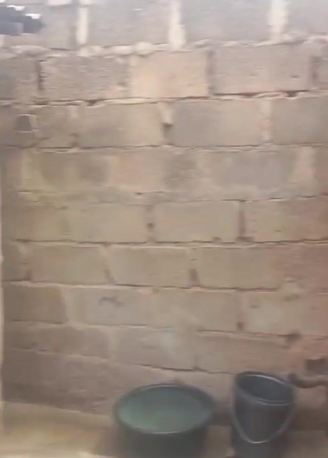 n exterior wall constructed from concrete blocks. The wall features two entrances. One entrance is a partially open doorway without a door. The other entrance is closed with a rusty, brown metal door secured with a padlock. The concrete wall is covered in a rough layer of light-colored plaster. A gray pipe runs vertically alongside the open doorway. The ground in front of the wall is unpaved.