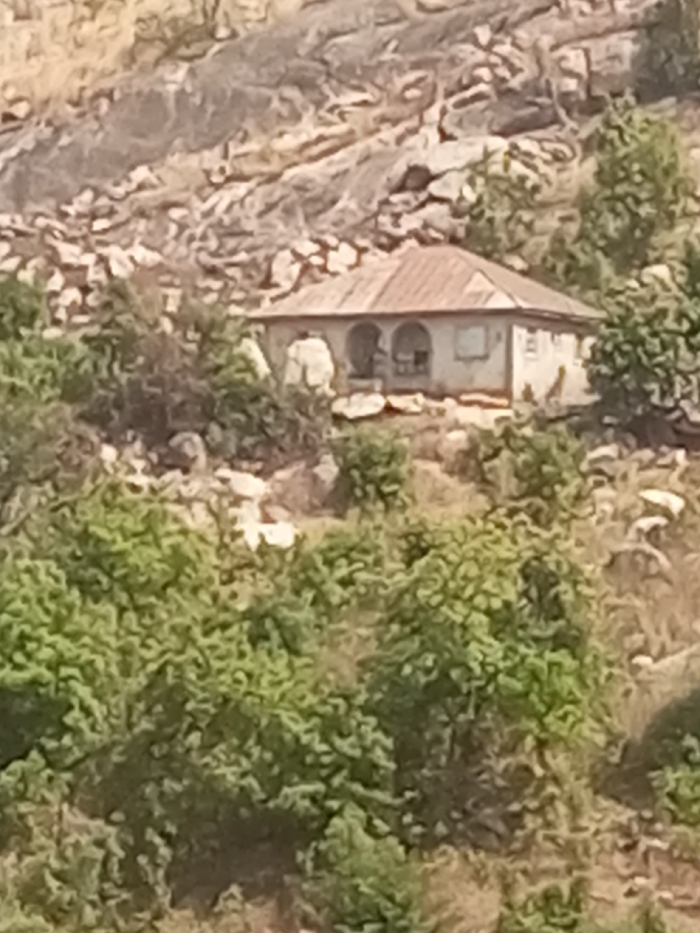 A small, weathered house sits nestled into a rocky hillside. The structure features a simple, rusty roof, arched openings, and faded white walls. Lush green bushes and trees surround the house, contrasting with the rough, light-colored rock formations behind it. The house appears isolated and integrated into the natural environment.