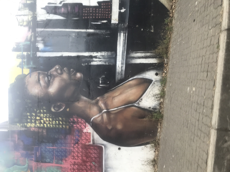 The image depicts a large-scale mural painted on a concrete wall in the Maboneng Precinct, Johannesburg, South Africa