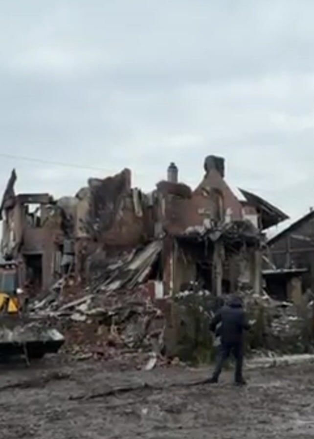 destroyed building, likely a house, with only parts of the brick walls remaining. There is rubble and debris scattered around. Two yellow backhoe loaders are visible near the destroyed structure. A man in a dark jacket walks through the muddy ground towards the building, appearing to take pictures with his phone. The sky is overcast.