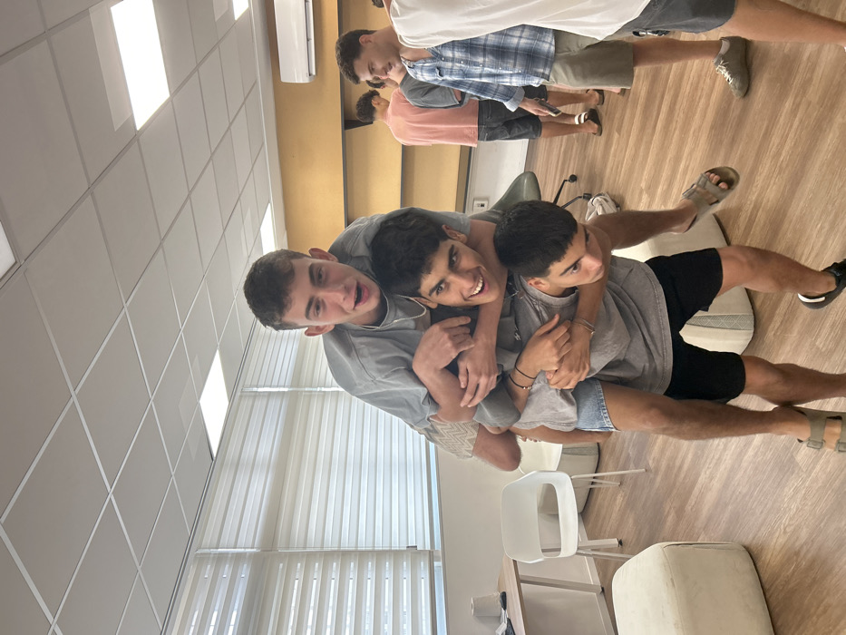 The image depicts an indoor scene within a modern building in Tel Aviv, Israel. Three young men are engaged in a "piggyback" chain, or human pyramid, in the foreground, facing slightly right of the camera. The topmost individual, with light brown hair, wears a light gray short-sleeved t-shirt and patterned shorts, holding onto the shoulders of the person below him with an open-mouthed expression. The middle individual, with dark hair, wears a dark gray short-sleeved t-shirt and blue denim shorts, smiling broadly as he supports the top person and holds onto the waist of the bottom individual. The bottom individual, also with dark hair, wears a light gray short-sleeved t-shirt and black shorts, displaying a focused expression while carrying the two individuals above him. He wears dark sandals. Several other young men are visible in the mid-ground and background. One individual on the right wears a blue and white plaid shirt and khaki shorts, looking towards the left. Another in the background wears a pink short-sleeved t-shirt. The room features light wooden flooring and a white drop ceiling with square acoustic panels and embedded rectangular LED light fixtures. White walls on the left transition to a yellow-brown accent wall on the right. Large windows on the left are covered with light-colored horizontal blinds. A white wall-mounted air conditioning unit is present on the right wall. Furniture includes a light wooden desk or table and a white plastic chair on the left, and several light beige square ottomans are visible on the floor throughout the space. A dark office chair with wheels is partially visible in the mid-background.