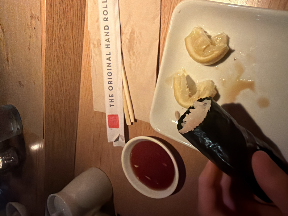 An overhead shot reveals a partially eaten sushi hand roll held by a hand