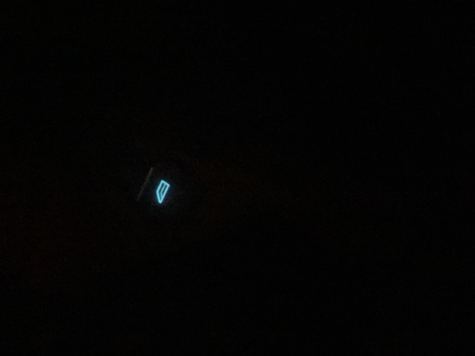 The image displays an extremely dark scene, predominantly black, with a single illuminated object positioned slightly above the center-right. This object is a small, rectangular control switch featuring a glowing cyan-blue icon. The icon depicts a stylized representation of a car window, with a flat top line and an angled lower portion, combined with an upward-pointing arrow. This design is consistent with a power window control button, likely indicating the "window up" or "window close" function within a vehicle. The surrounding environment is completely obscured by darkness, suggesting an interior setting in extremely low light, such as a car cabin at night. No individuals, actions, or interactions are discernible. The image provides no discernible information regarding the city of Tbilisi, Georgia, or any other external location.
