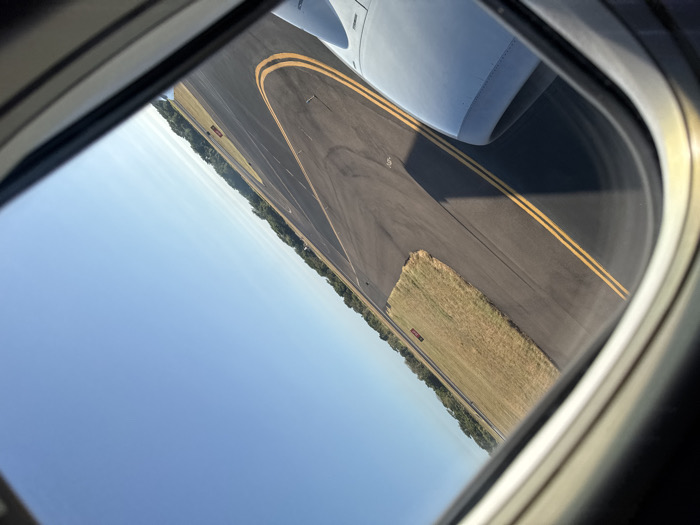 A view from an airplane window shows a tarmac with yellow lines, patches of grass, and a glimpse of trees in the distance