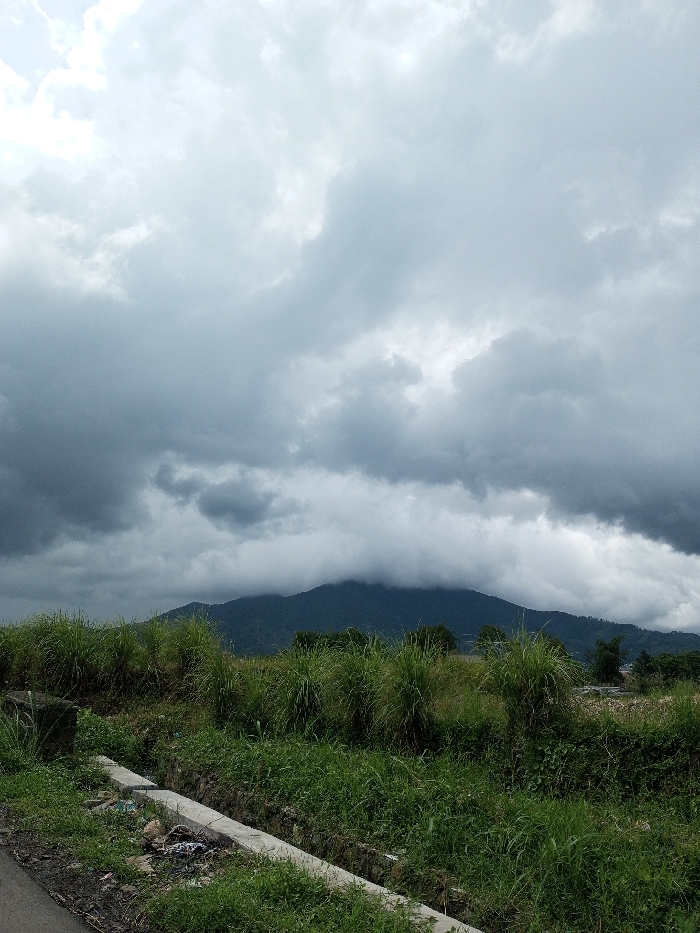 The scene depicts an outdoor landscape near Ganja City, Azerbaijan, under a heavily overcast sky. Dark grey, voluminous clouds, varying in density and illumination, fill the upper two-thirds of the frame. In the midground, a prominent dark green mountain range is visible, with its upper slopes and peaks partially obscured by a thick band of low-hanging fog or clouds. The foreground consists of dense, untamed green vegetation, predominantly tall grasses and weeds. A dark asphalt or dirt road surface occupies the bottom-left corner. Running parallel to this road, a concrete drainage ditch traverses the lower-mid foreground, containing scattered refuse, including plastic debris. No human or animal subjects are present, and no discernible actions or interactions are occurring within the depicted environment.