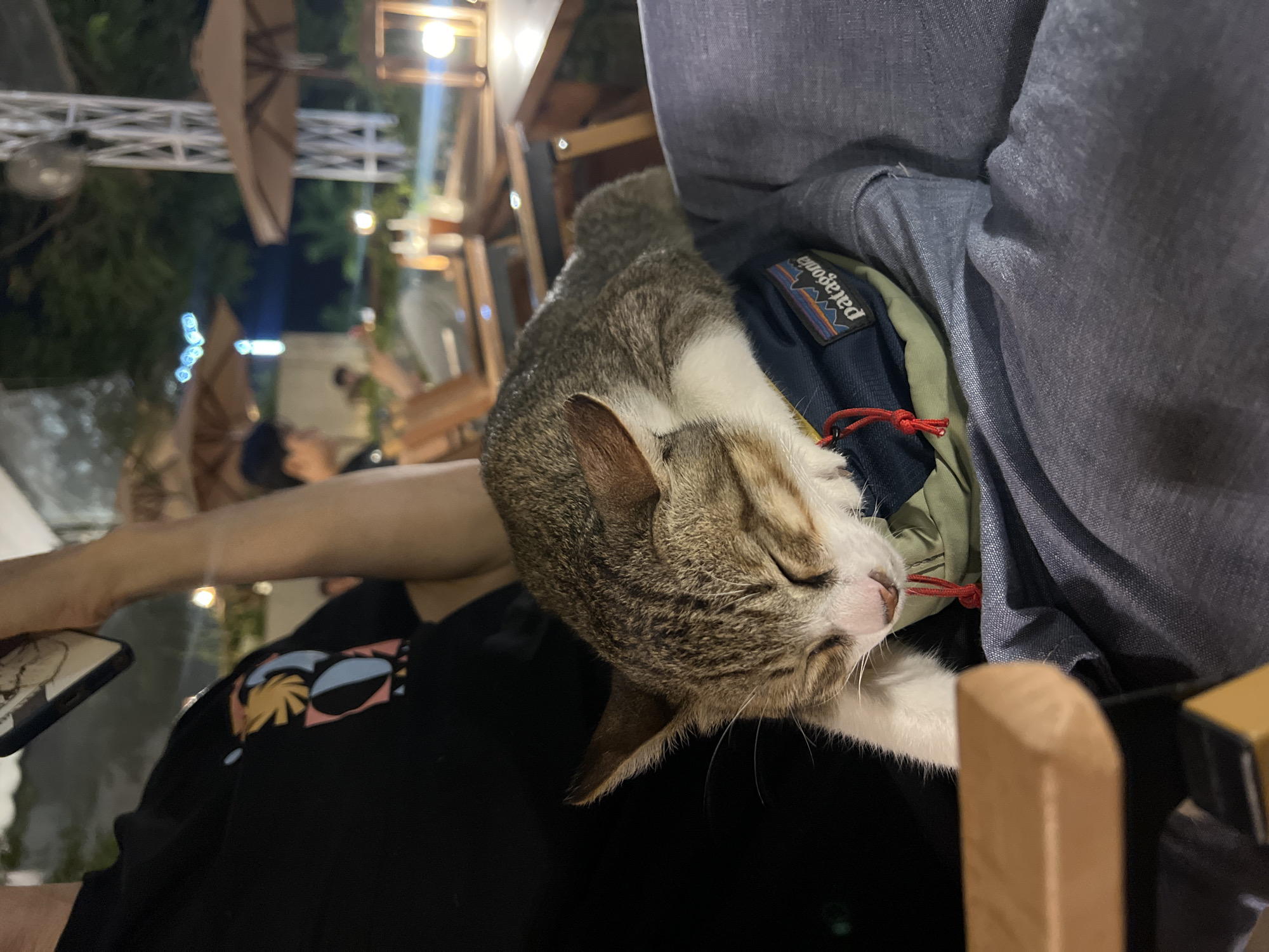 - "An image captured at night in Nha Trang, Vietnam, shows a tabby and white cat sleeping curled on a navy blue Patagonia fanny pack" by FM-tU9Xy1, licensed under CC BY 4.0