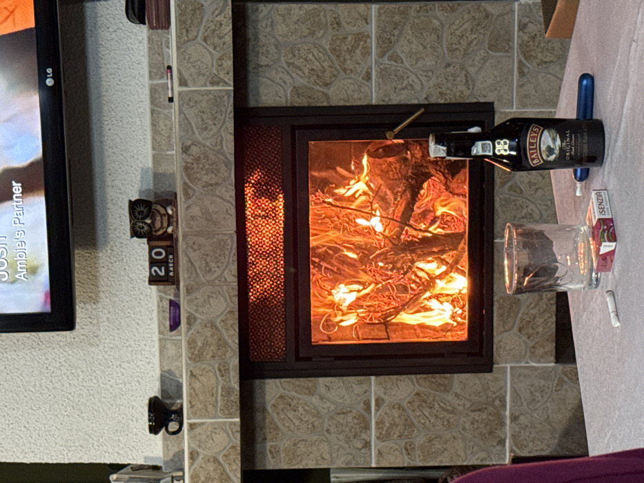 The scene depicts a domestic interior in Lozen, Bulgaria, centered on a stone-tiled fireplace with a visible, burning wood fire. Above the fireplace, a mantelpiece displays a dark ceramic mug, a small purple dish, a wooden block calendar set to "20 MARCH," and a carved wooden owl figurine. To the right of these items, a black marker pen and a dark rectangular object are present. Mounted on the textured, light-colored wall above the mantelpiece is a black LG flat-screen television, displaying text that includes "JOSH Ambie's Partner." In the immediate foreground, a light-colored tablecloth covers a table. On this table are an empty, clear glass tumbler, a bottle of Baileys Original Irish Cream liqueur (approximately two-thirds full) with an "88" label on its neck, a red and white pack of "ISENZIA" cigarettes with one cigarette lying adjacent, and a blue cylindrical object. The upper arm and shoulder of an individual, wearing a purple garment, are partially visible on the far left of the frame. The primary illumination within the central area appears to originate from the fire itself.