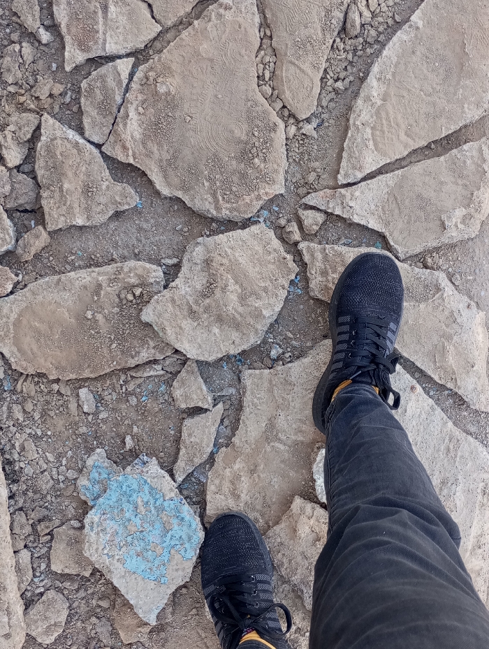 The scene depicts a fragmented, unpaved ground surface in Guacara, Venezuela, viewed from an overhead perspective. A person is present, evidenced by their lower extremities: a pair of dark grey or black denim jeans and two black athletic sneakers with black laces. The left foot is positioned towards the bottom-left of the frame, and the right foot is towards the mid-right, indicating a standing or walking posture. The ground is composed of numerous irregular, light brown/tan concrete or stone fragments of varying sizes and shapes, interspersed with exposed dirt, small pebbles, and debris. A prominent, irregularly shaped piece of concrete in the lower-left quadrant exhibits significant remnants of light blue paint on its surface. Some larger concrete fragments display faint circular or concentric patterns. The environment suggests a neglected or damaged outdoor area.