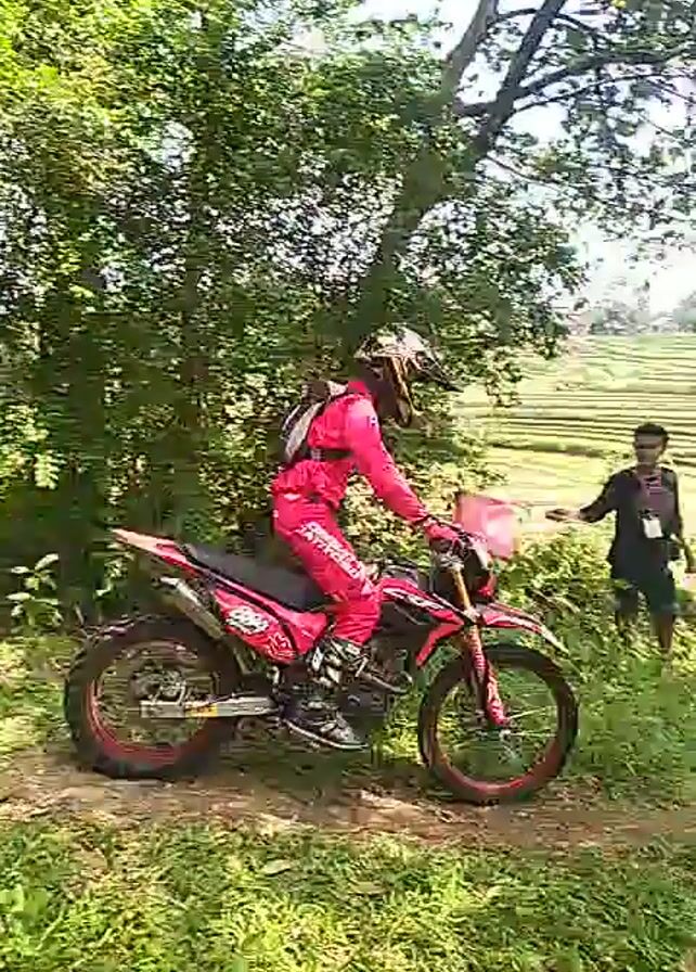person in red motorcycle gear riding a dirt bike on a trail. The background reveals a tiered rice paddy landscape, typical of Southeast Asia. Several other people, possibly observers, are present near the trail. The scene appears to be outdoors in daylight, with natural vegetation.
