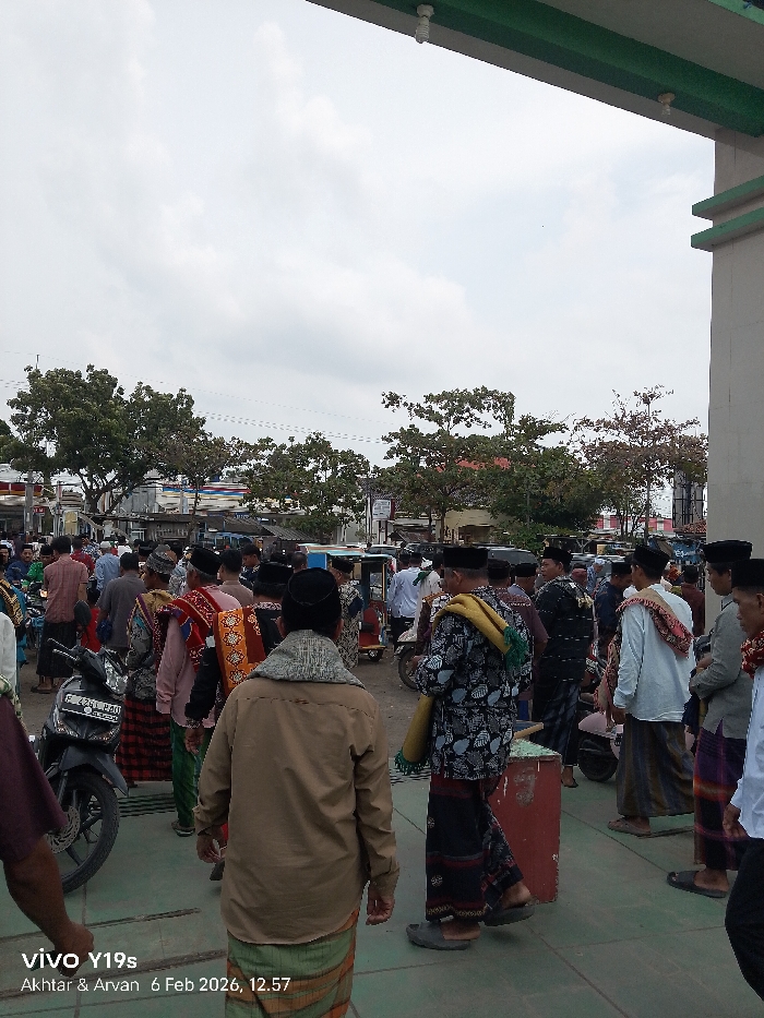 A crowded outdoor scene shows people gathered near a building. Many men are dressed in traditional Islamic clothing, including long shirts, sarongs, and caps. A few motorcycles are parked nearby. Trees are visible in the background under a cloudy sky. The architecture suggests a mosque or religious site.