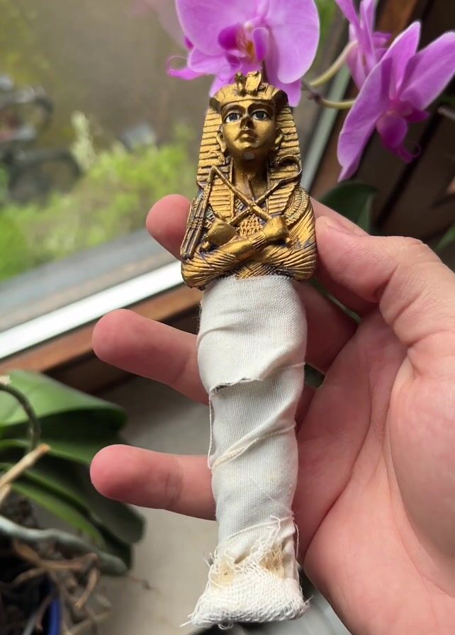A hand holds a small, decorative mummy figurine. The upper part of the figurine, representing the pharaoh, is gold-colored and detailed, while the lower body is wrapped in white cloth. The figurine is held in front of a window with a blurred green outdoor view and next to a purple orchid. The camera rotates the figurine to show different angles.