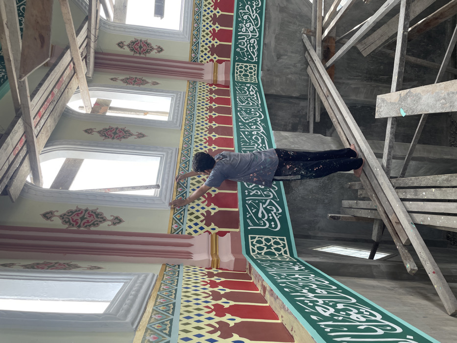 An adult male stands barefoot on a makeshift wooden scaffolding inside a building in Mns Asan, Indonesia, actively engaged in decorative painting. The man, wearing a paint-splattered grey short-sleeved shirt and dark trousers, is seen from the back, reaching upwards with both hands towards a wall. The interior features elaborate Islamic architectural and decorative elements. The upper wall section is light yellow/cream, adorned with ornate pink and red columns. Below a row of arched, open windows, a horizontal band displays repeating geometric patterns in gold, blue, green, red, and brown. Below this, a darker red/brown section exhibits a series of inverted arch-like shapes. A prominent teal-green band with white Arabic calligraphy runs horizontally below the red/brown section, directly above the man's eye level. The lower visible wall section is unfinished concrete. A small, diamond-shaped window is visible on this lower wall. The wooden scaffolding consists of multiple planks and beams, some of which show paint splatters. The bright light streaming through the unpaned arched windows illuminates the scene, indicating an interior under active finishing.