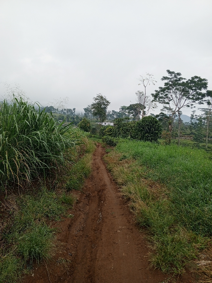A muddy path cuts through a landscape of verdant grass and varied trees under an overcast sky. Lush green foliage flanks the dirt trail on both sides, while scattered trees dot the background. A building is subtly visible amidst the greenery. The scene evokes a sense of rural tranquility, typical of an agricultural setting.