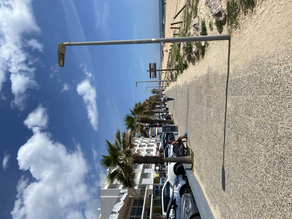 The image displays a coastal scene on the promenade in Quarteira, Portugal, under a clear blue sky with scattered white cumulus clouds. The perspective is longitudinal, extending along the promenade. To the left, a row of multi-story white residential and commercial buildings fronts a street occupied by parked vehicles, including several cars and SUVs. A line of mature palm trees separates the paved promenade from the street and buildings. One male individual, shirtless and wearing dark shorts, is seated on a dark bench beneath a palm tree on the left side of the promenade. Blue objects are visible on the ground beside him. Further along the promenade, another individual walks away from the camera. To the right, a sandy beach extends towards the Atlantic Ocean, with scattered beachgoers visible in the distance, some under umbrellas. A breakwater is discernible where the beach meets the water. A tall, grey street light pole stands prominently in the right foreground, casting a long shadow across the light-colored aggregate promenade surface. Adjacent to the promenade on the beach side are patches of sparse vegetation, rocks, and sections of rope and wooden post barriers.