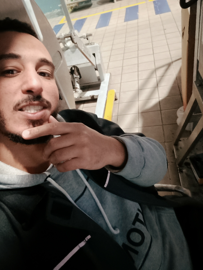 A man poses indoors, his hand thoughtfully touching his chin. He sports a gray hoodie under a dark jacket. The background features a tiled floor with blue and yellow markings, a tall white machine, and glimpses of other equipment, suggesting an industrial or commercial setting. The lighting is soft, casting subtle shadows and illuminating the man's face.