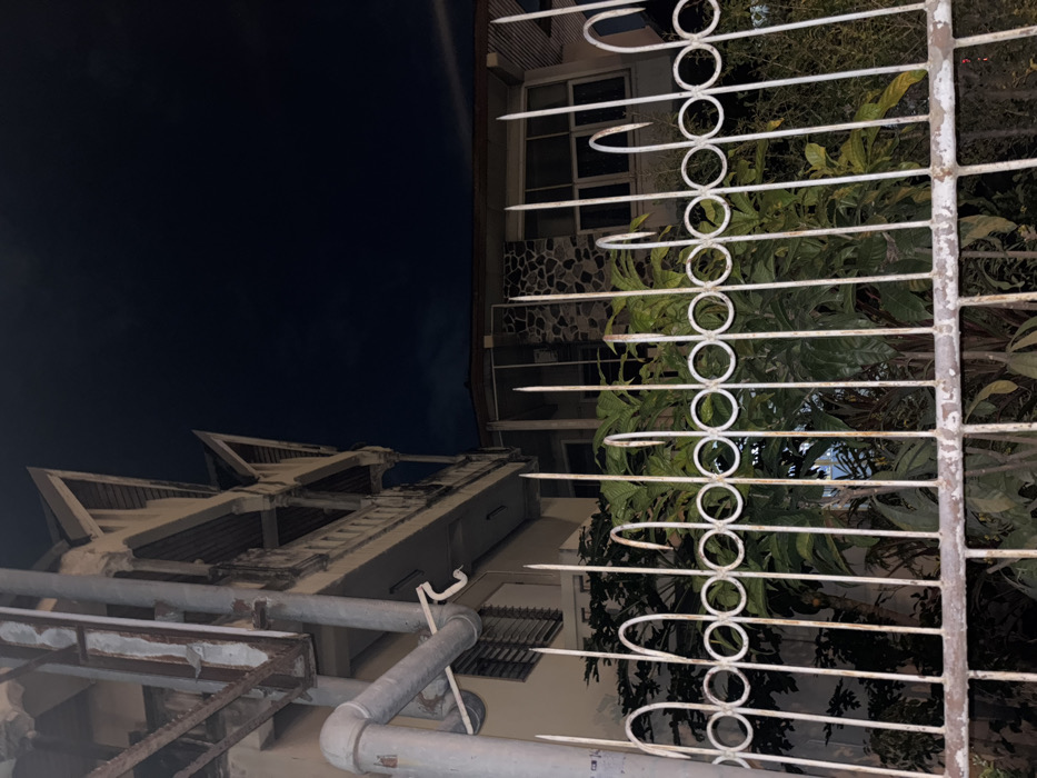 A nighttime, static, eye-level photograph captures a residential scene in Chiang Mai City Municipality, Thailand, viewed through a weathered white metal fence