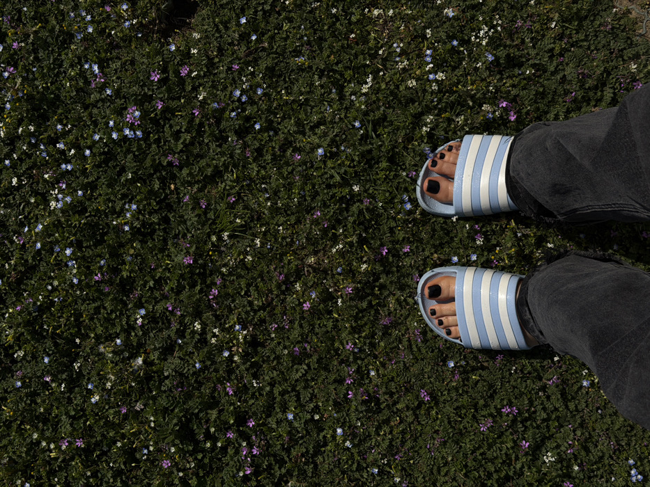 The image presents an overhead, slightly angled perspective of a person's lower legs and feet