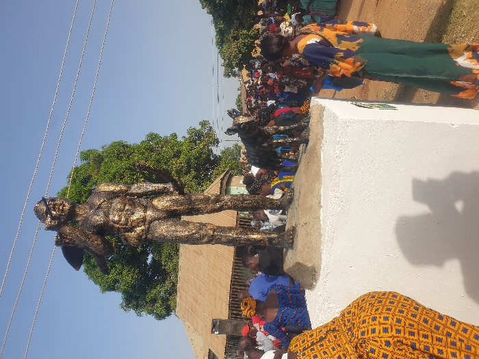 A bronze-toned statue of a man stands on a concrete plinth. An audience is gathered in the background, including a person wearing a blue and yellow dress. The sky is clear. Trees provide some greenery. Overhead power lines stretch across the frame. A building with a brown roof is also visible in the lower part of the picture.