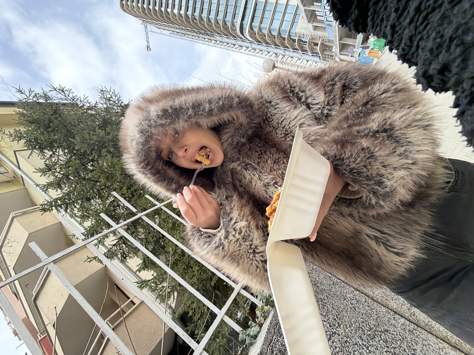A female individual, facing the camera, is shown eating outdoors in Sofia, Bulgaria. She is wearing a brown faux fur hooded coat and dark trousers, holding a white, ribbed, disposable takeaway container in her left hand and bringing food to her open mouth with a clear plastic fork held in her right hand. The food in the container appears to be a pasta-like dish. The background features an older, light-colored multi-story residential building with balconies and metal railings on the left, partially obscured by evergreen trees. To the right, a tall, modern high-rise building with a distinctive curved, ripple-like glass facade is visible under construction, identified as Capital Fort in the Mladost 4 district. A construction crane is situated above the modern building. The sky is partly cloudy. A dark, textured object is partially visible in the bottom right foreground.