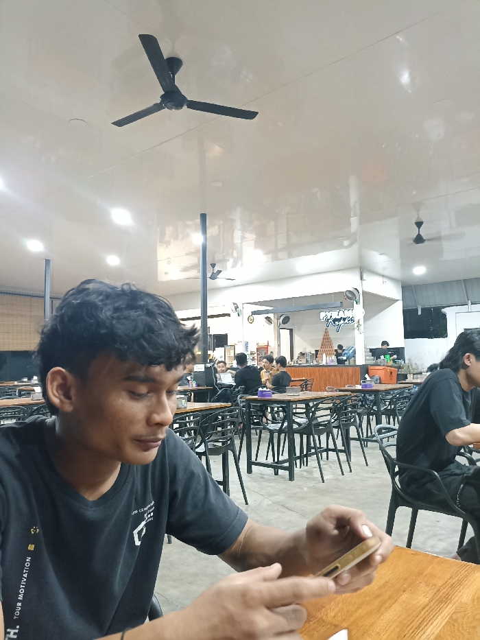 The image depicts an indoor scene within a modern cafe or coffee shop, identified as potentially "Pirami Kafee" in Lhokseumawe, Indonesia. The establishment features a large, open layout with a reflective white ceiling equipped with multiple bright, recessed square light fixtures and several black three-bladed ceiling fans, one prominent in the upper center and another smaller one further back. Black support pillars are visible throughout the space. In the foreground, a young adult male with dark, wavy hair and a black t-shirt is seated at a light-colored wooden table. He is engaged with a light-colored smartphone, holding it horizontally with both hands, his right index finger poised over the screen. His gaze is directed downwards at the device. The midground reveals an array of dark, stackable plastic chairs paired with rectangular and square wooden tables. Several other patrons are seated at various tables. To the far right, partially visible, another male with long dark hair, also wearing a black t-shirt, is seated at a table. Further back, near a central counter area, multiple individuals are gathered; one group of three to four men is seated at a table to the left of the counter, two facing each other. The counter, appearing to be a service or bar area, displays bottles and equipment, with a sign above it that reads "PIRAMI" with stylized text below it, consistent with "KAFEE." A person is visible standing behind this counter. An orange cooler or container rests on the floor to the right of the counter. On the far left, a rolled-up bamboo blind is visible. The floor is a light grey concrete or tiled surface.