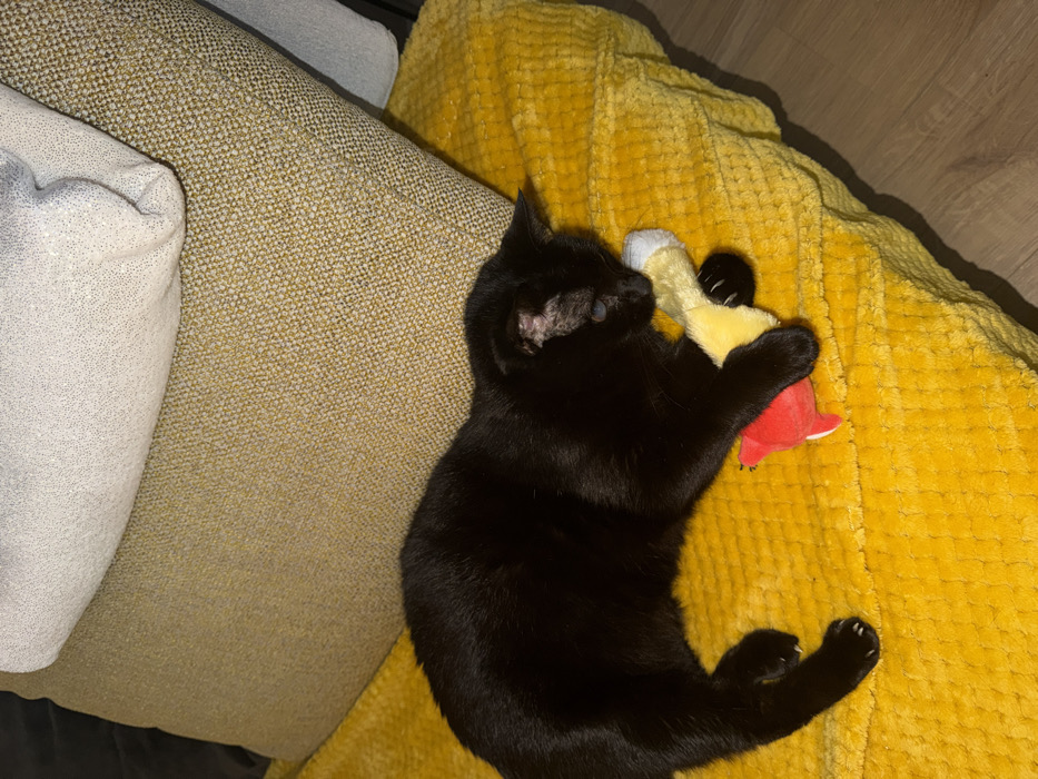 A black cat is curled up on a yellow blanket, nestled next to a textured yellow cushion and a light gray pillow. The cat is clutching a small, plush toy with yellow and red elements. The cat's head is visible with a slightly textured ear. The background is a wooden surface.
