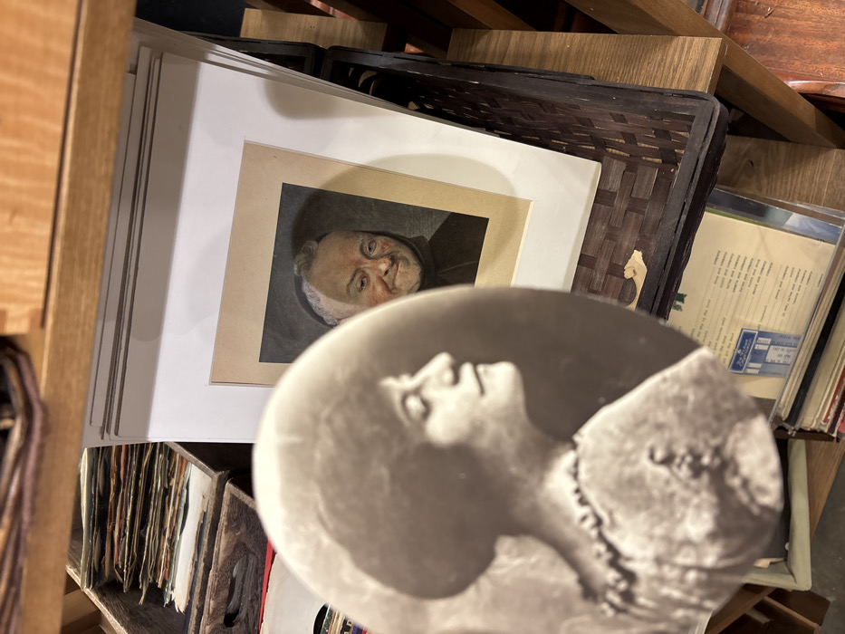 A cluttered shelf showcases various items. On the left, several framed prints lean against a wooden support. One print depicts a portrait of a man with white hair. In the foreground, a round, weathered monochrome image of a woman's profile obscures a portion of the scene. Adjacent to the prints, a dark woven basket sits beside a stack of records or documents, some of which are in clear sleeves. The scene suggests a storage space or an antique shop filled with diverse objects.
