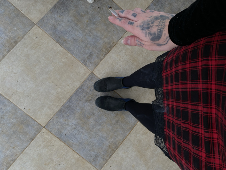 An overhead image displays the lower body of an individual standing on a tiled floor in the city of Kunje, Montenegro. The subject wears black opaque tights and dark flat shoes, possibly with blue accents. A red and black plaid skirt with a black lace hem covers the upper thighs. The individual's right hand, heavily tattooed with a skull design on the back and script on the knuckles, holds a lit cigarette between the index and middle fingers. Smoke is visible rising from the cigarette and subtly around the skirt's hem. The floor consists of large, diagonally arranged square tiles, alternating between light beige and gray-brown colors, showing some surface texture and minor debris.