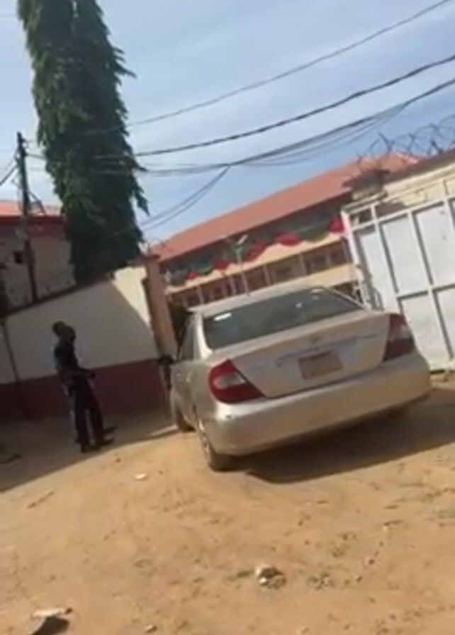 gold Toyota Camry parked on a dirt road next to a building. The building is decorated with red and green banners. There are two tall evergreen trees next to the building. A man in a dark uniform stands next to the car. Another man in a patterned white shirt and black pants walks towards the gate of the building. There are power lines and a barbed wire fence surrounding the building. The sky is blue and the weather appears sunny.