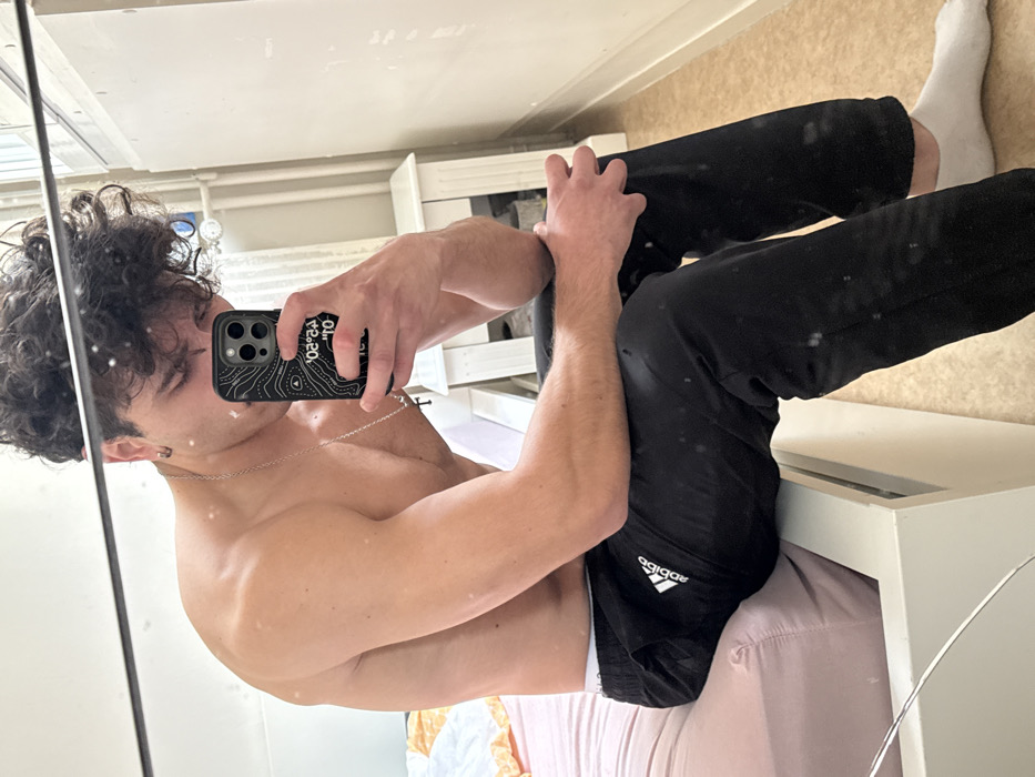 A young adult male with dark, curly hair and a muscular physique is captured in a mirror selfie