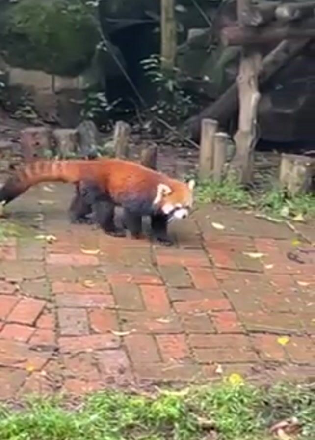 red panda walking on a brick path in an outdoor enclosure. The panda has reddish-brown fur on its body, black legs, and a bushy, ringed tail. It walks slowly along the path, looking around. The enclosure has green grass and trees, as well as some wooden structures.