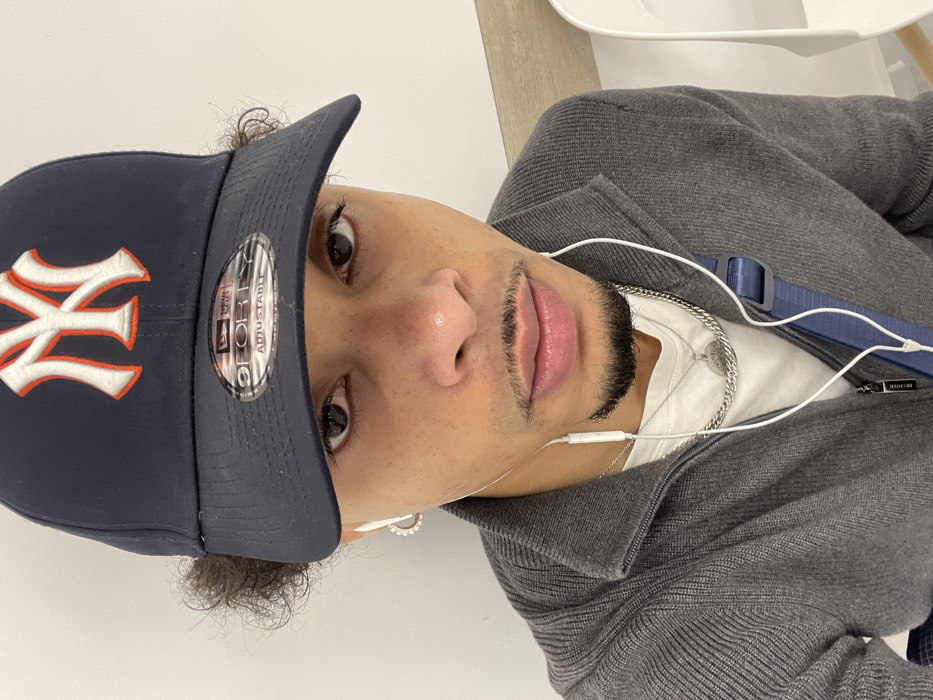 A male subject with light brown skin, dark eyes, and a trimmed beard and mustache is depicted in a close-up, front-facing indoor portrait within the city of Plaisir, France. He wears a navy blue New York Yankees baseball cap with a white "NY" logo outlined in orange, a dark gray ribbed zip-up cardigan over a white t-shirt, and multiple silver chain necklaces, one being a Cuban link style and another with a circular pendant. White wired earbuds are visible, with the wires extending downwards, and a small silver hoop earring with visible stones is present in his left ear. A blue strap, possibly from a shoulder bag, is visible over his right shoulder. The subject gazes directly into the camera with a neutral expression. The background consists of a plain, light-colored wall, with a portion of a white chair and a light-colored surface visible on the right side of the frame, suggesting an institutional or waiting room type of indoor environment. The lighting is uniform and artificial.
